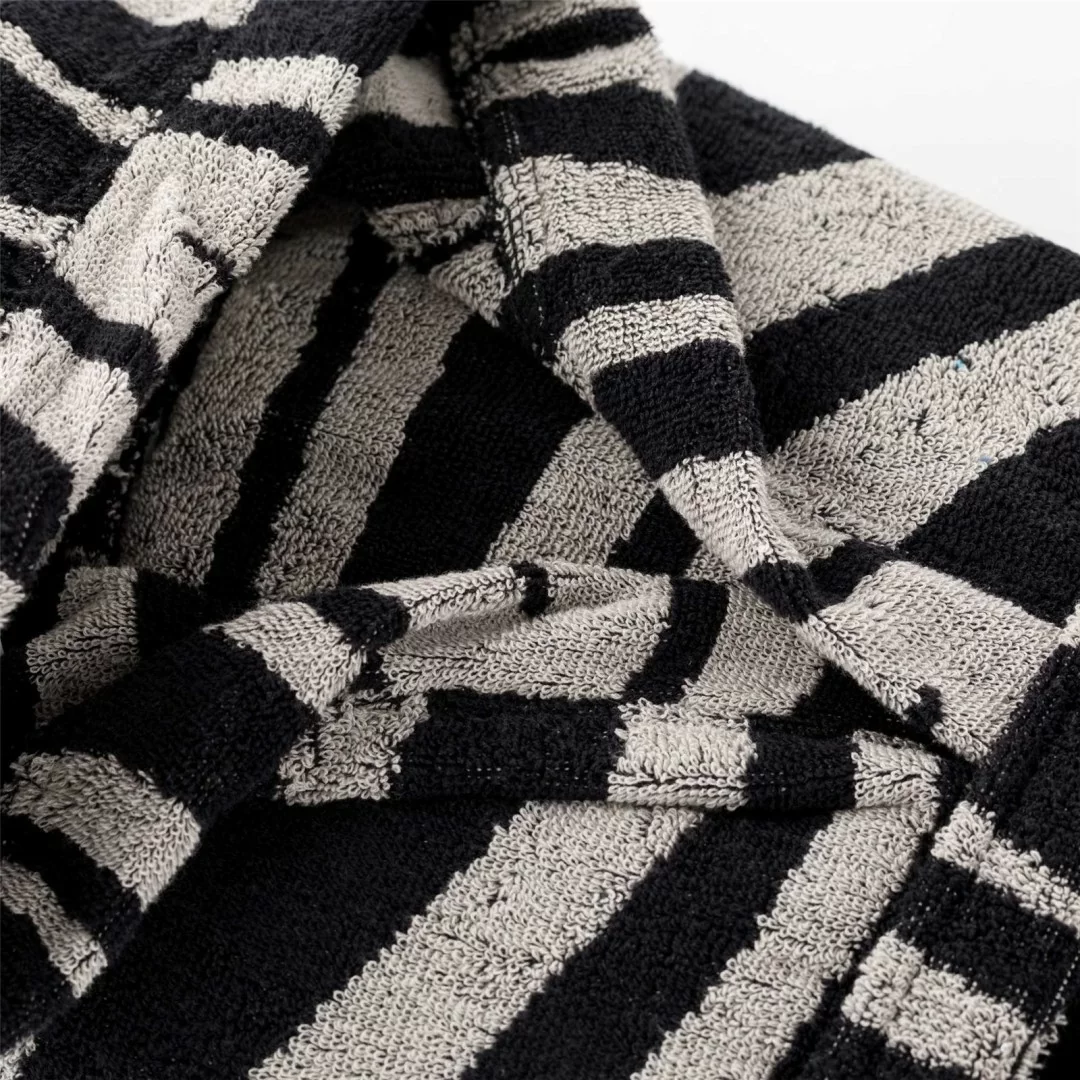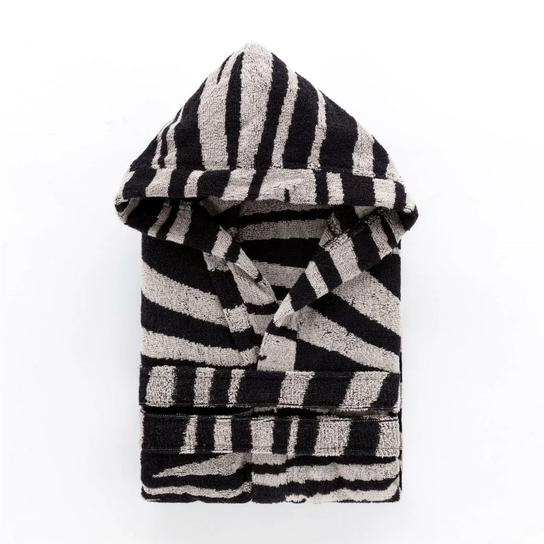 La tramatura zebrata, sapientemente lavorata, aggiunge un tocco di raffinatezza selvaggia, trasformando un semplice accappatoio in un elemento di stile distintivo. Ogni dettaglio è curato con attenzione: dalle cuciture precise che ne assicurano la durabilità, al design con cappuccio, che offre un ulteriore livello di calore e protezione.