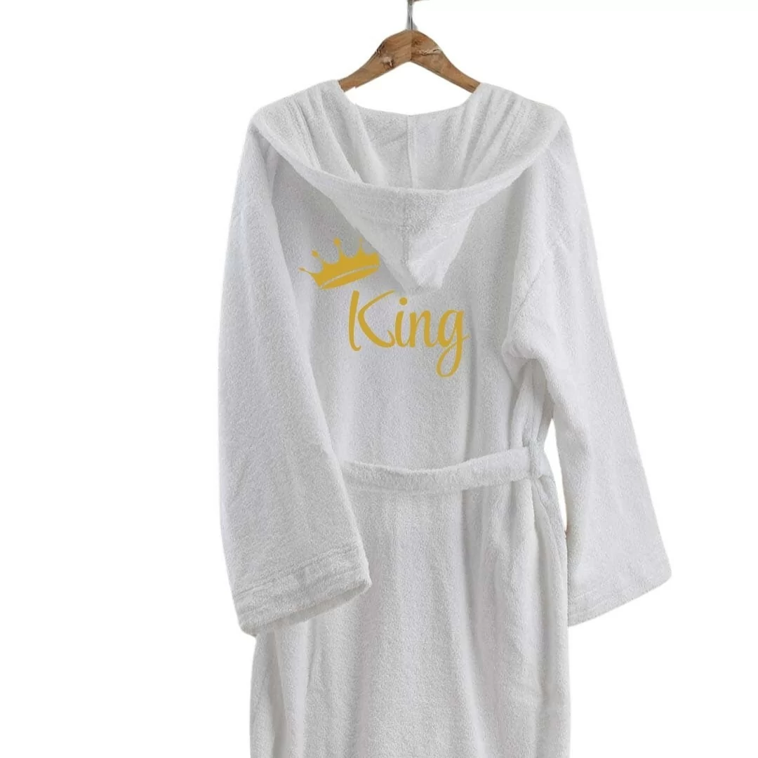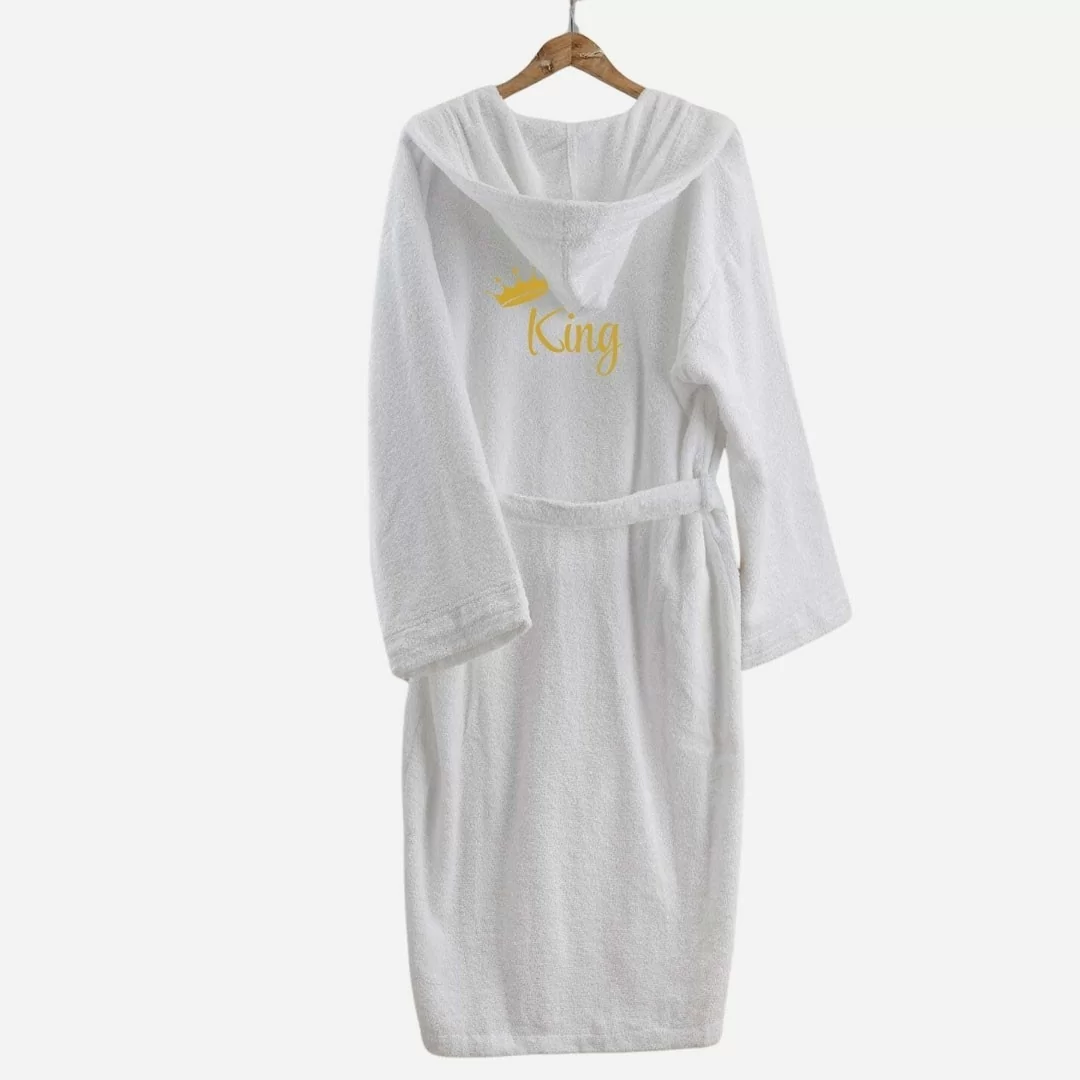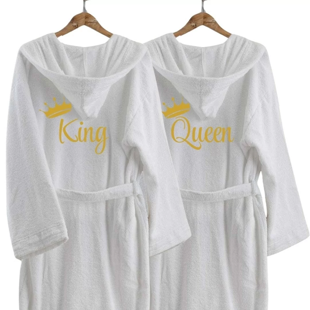 Il design sobrio ed elegante si arricchisce di un raffinato ricamo "King" e "Queen" sul petto, simbolo di esclusività e stile per lui e per lei. Il colore bianco puro evoca un senso di pulizia, serenità e armonia, rendendo questi accappatoi un'aggiunta perfetta al vostro guardaroba da bagno.