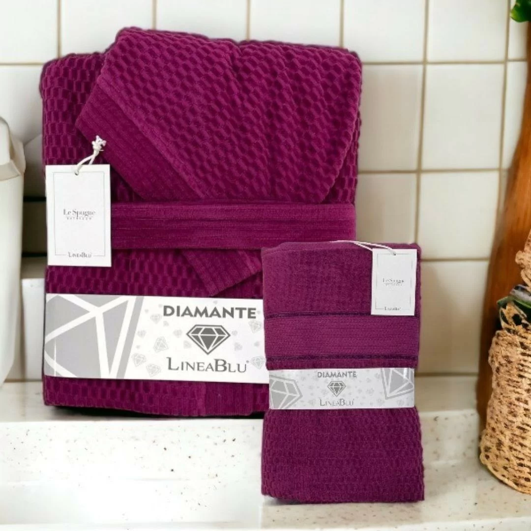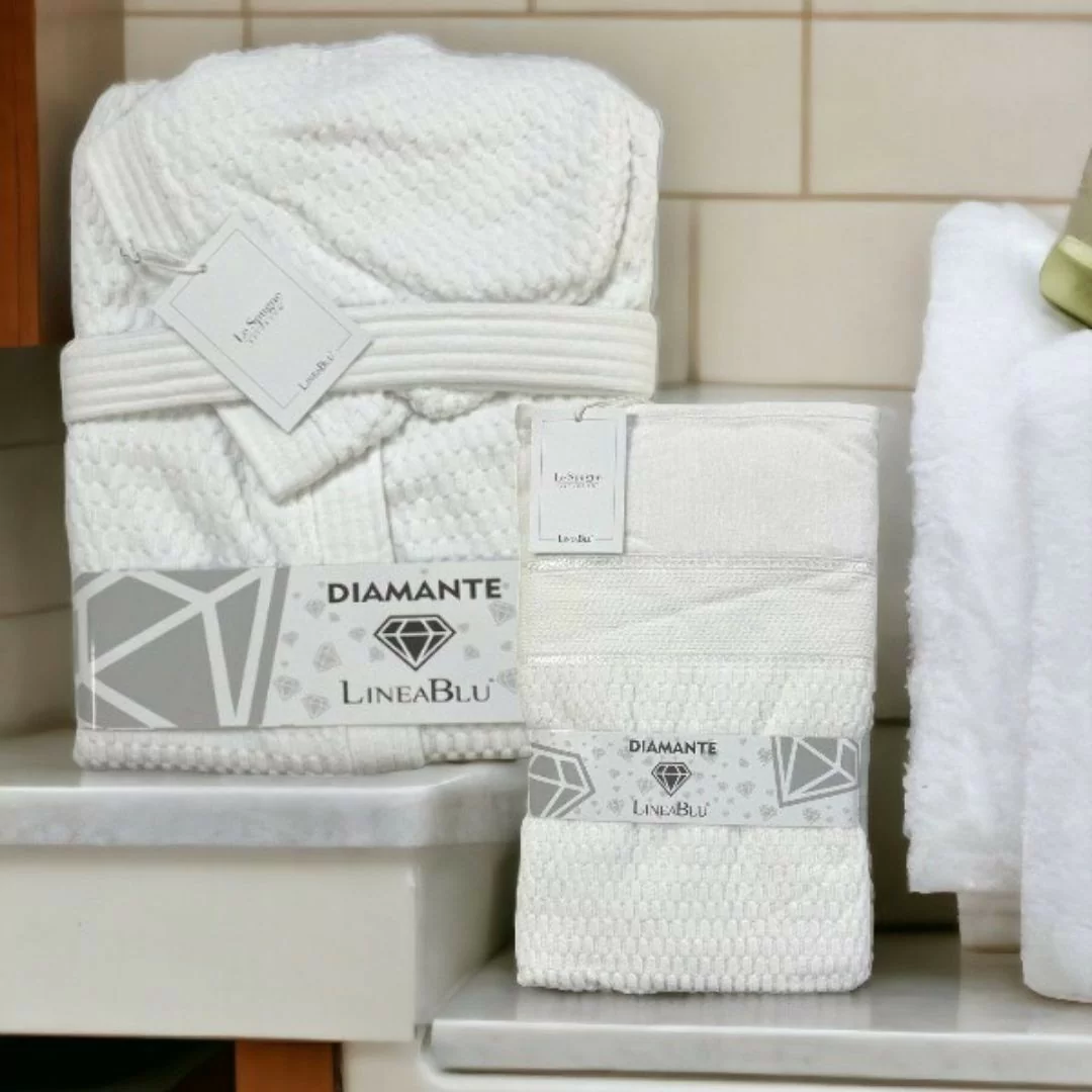 Coppia Asciugamani e Accappatoio LineaBlu art. Diamante Spugna. Celebra il tuo comfort quotidiano con il Set Accappatoio e Asciugamani LineaBlu, un'opulenta fusione di eleganza e praticità. Questo set raffinato presenta una trama distintiva in 100% cotone, offrendo una sensazione di lusso che avvolge la tua pelle.