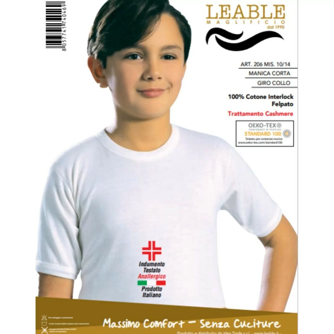 T Shirt Intima Bimbo Leable art. 206 Girocollo Cotone. Scopri il massimo comfort e lo stile inconfondibile delle nostre t-shirt per ragazzi! Realizzate in puro cotone interlock rasato, queste magliette manica corta con girocollo offrono un tocco leggermente felpato all'interno, avvolgendoti in un calore avvolgente. La qualità impeccabile e lo stile raffinato sono garantiti, grazie alla produzione Made in Italy. Vestibilità comoda e materiali di prima qualità rendono queste t-shirt un must per il guardaroba di ogni giovane amante della moda. Sperimenta il meglio della moda con le nostre t-shirt, perfette per ogni occasione!