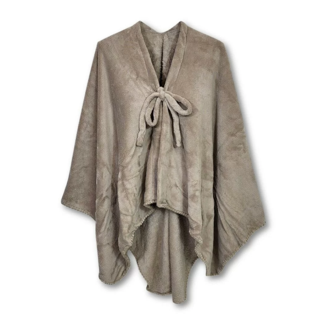 Il fiocco tono su tono, applicato sul davanti, aggiunge un tocco di femminilità e raffinatezza, rendendo la mantella non solo pratica ma anche estremamente glamour. È ideale da indossare in casa per rilassarsi sul divano, durante la lettura o la visione di un film, ma anche perfetta da utilizzare nelle mezze stagioni come coprispalle elegante.
