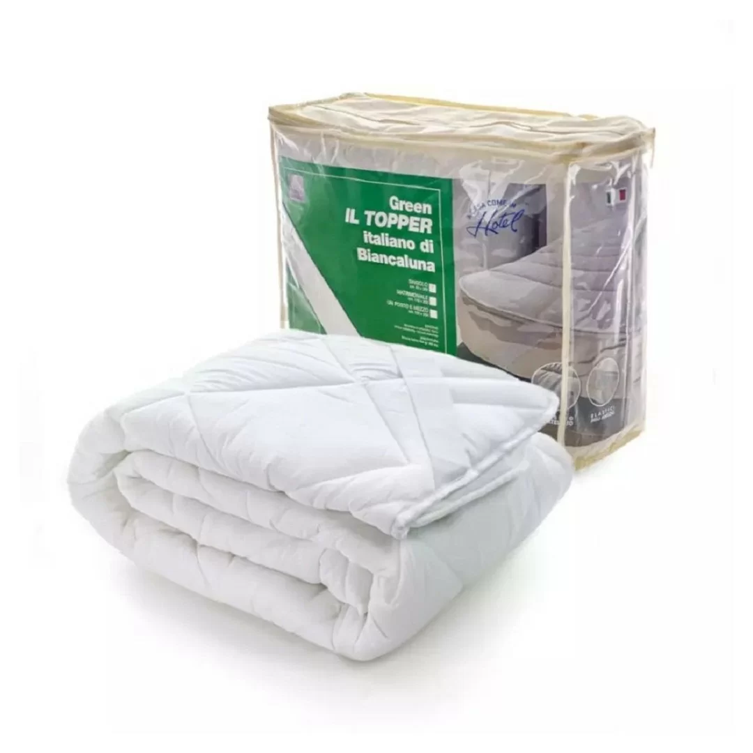 TOPPER MATERASSO CORRETTORE BIANCALUNA GREEN CON ELASTICO AGLI ANGOLI PER LETTO PRODOTTO IN ITALIA DA BIANCALUNA; IL TOPPER DI BIANCALUNA IMBOTTITO E TRAPUNTATO E' UNA VALIDA SOLUZIONE PER CHI NON VUOLE E NON PUO' SOSTITUIRE IL VECCHIO MATERASSO ORTOPEDICO, MA VUOLE AVERE UN RIPOSO MIGLIORE. SI FISSA FACILMENTE AGLI ANGOLI DEL MATERASSO TRAMITE FASCE ELASTICHE FORNENDOLI UNO STRATO AGGIUNTIVO CHE SI ADATTA AL PROPRIO PROFILO IN BASE AL CALORE CHE EMETTE IL PROPRIO CORPO. E' ALTAMENTE TRASPIRANTE, ANTIACARO, ANTIBATTERICO E ANALLERGICO. ACCESSORIO UTILISSIMO PER RENDERE PIU' CONFORTEVOLE IL SONNO E GARANTIRE UNA MAGGIORE PROTEZIONE AL TUO MATERASSO. MISURE MATRIMONIALE :170X200CM SINGOLO :85X200CM TESSUTO ESTERNO (MARTELLATO): MICROFIBRA DI POLIESTERE 100%, FINITURA EMBOSSING - TESSUTO MARTELLATO; MATERIALE IMBOTTITURA: SILICONE HOLLOW FIBER 400 GR/MQ; LAVABILE IN LAVATRICE A 30°.